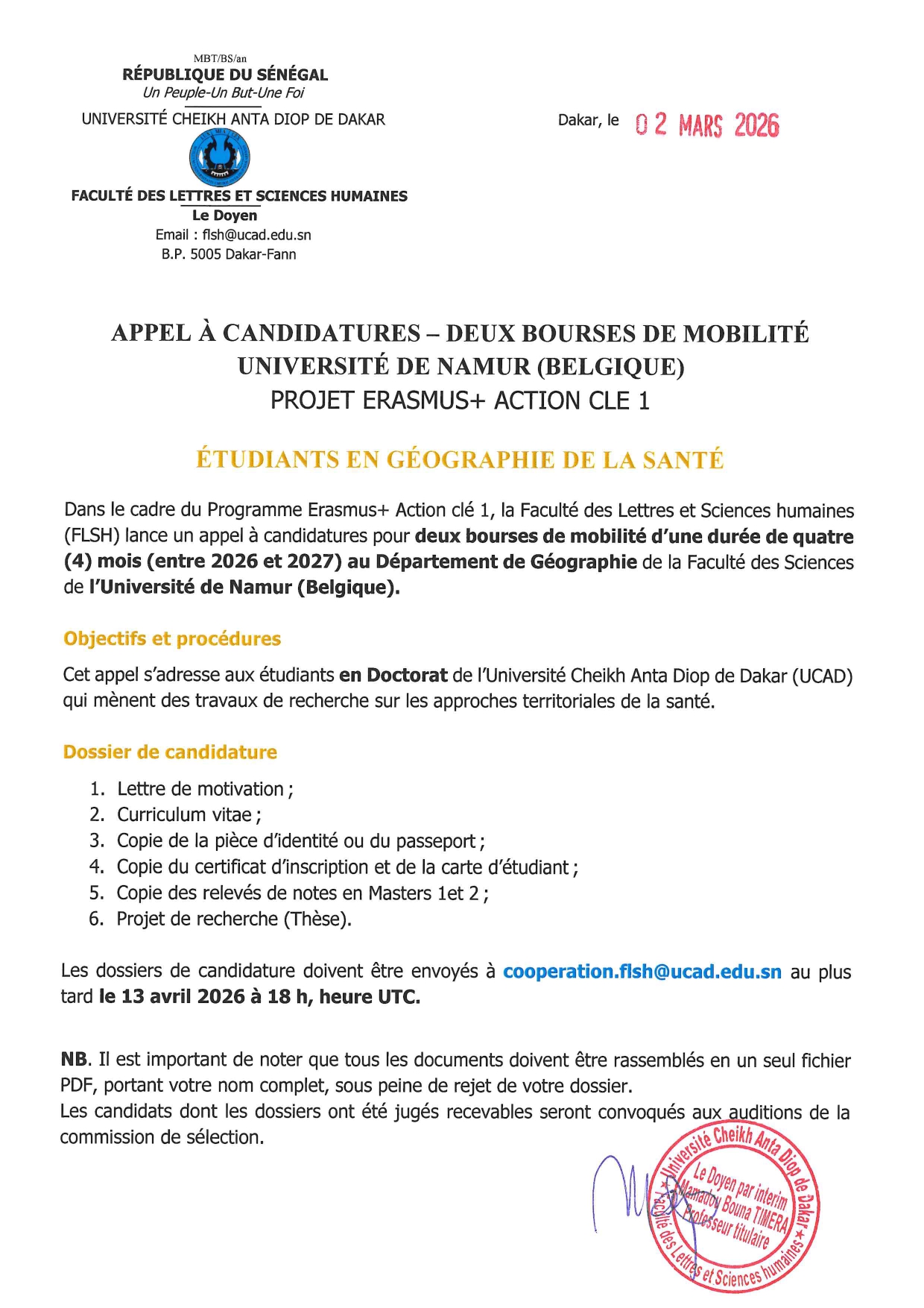 Dans le cadre du Programme Erasmus+ Action clé 1, la Faculté des Lettres et Sciences humaines (FLSH) lance un appel à candidatures pour deux bourses de mobilité d’une durée de quatre (4) mois (entre 2026 et 2027) au Département de Géographie de la Faculté des Sciences de l’Université de Namur (Belgique).